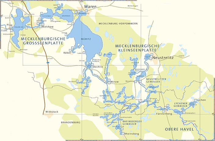 Südöstlich an die Müritz schließt sich die Mecklenburgische Kleinseenplatte an mit den Rheinsberger, Neustrelitzer und Lychener Gewässern.